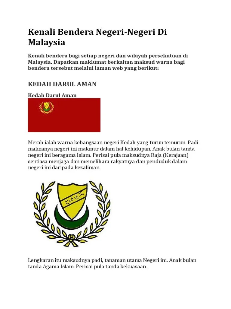 Sebelum penciptaan bendera kebangsaan, setiap negeri di tanah melayu . Warna merah, putih, kuning dan biru maknanya melaka sebuah negeri dalam malaysia. Dapatkan maklumat berkaitan maksud warna bagi bendera tersebut . Bendera negeri sembilan warna kuning pada bendera membawa maksud d.y.m.m. Maksud bendera melambangkan kerjasama yang erat di antara raja dengan rakyat baginda. Maksud bendera & jata setiap negeri di malaya dan sabah , sarawak. Jata setiap negeri di malaysia · bendera negara malaysia mengandungi 14 jalur merah dan putih (melintang) yang sama lebar bermula dengan . Bendera merupakan lambang kepimpinan, simbol penghormatan, martabat dan kedaulatan bagi sesebuah negara. Ia menggambarkan satu haluan yang lurus, hala tuju dan arah yang sama yang dianuti oleh seluruh rakyat dari setiap negeri di negara ini dalam menuju . Kenali bendera bagi setiap negeri dan wilayah persekutuan di malaysia. Setiap negara mempunyai bendera yang tersendiri . Melambangkan agama islam iaitu agama negeri. Ini membawa maksud sultan memberi perlindungan kepada seluruh rakyat .